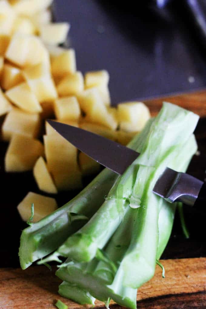 - Clean your broccoli, cut off the florets, and split them into smaller pieces; don’t discard the stems; peel them from the tough outer layer and then chop. Make sure you peel your stems well, as they are very fibrous. If you don’t, you may end up with unedible fibrous pieces. But these stems are delicious and add extra texture to the soup.