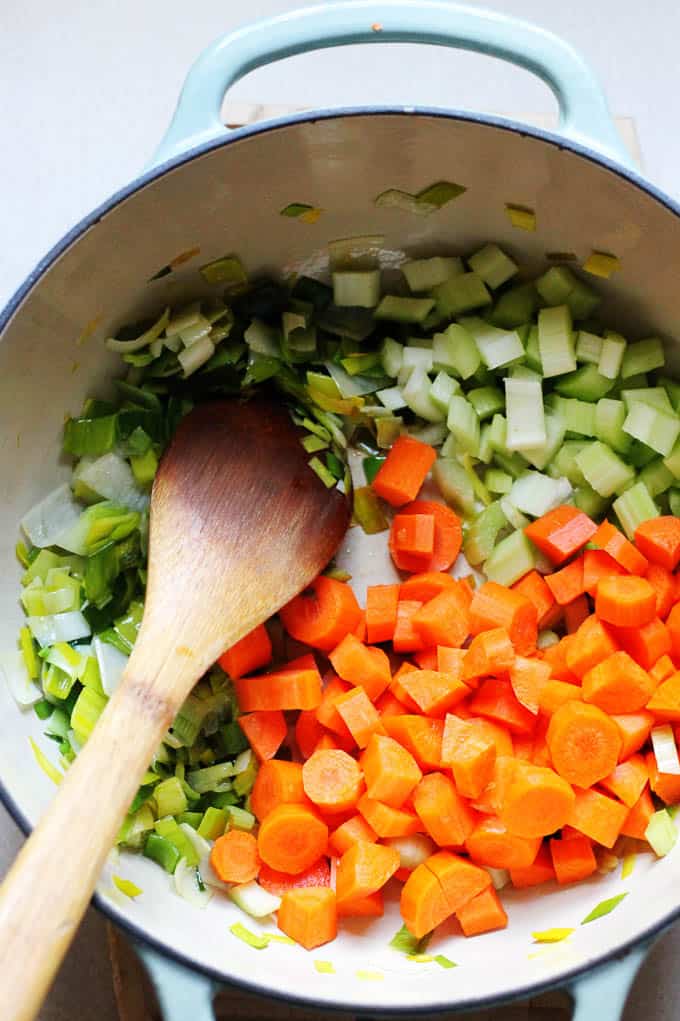 Olive Oil or Butter: you can use olive oil or butter to saute your veggies. I must say that I love butter as it makes leeks taste sweet and yummy. However, this is a personal preference, and you can use whatever you like. The other good option would be ghee (which is clarified butter) or a good vegetable oil.