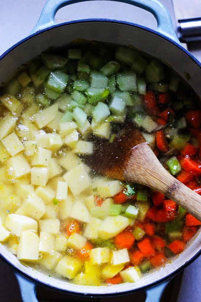 Broth and Seasoning: every soup will need salt, but instead, you could use a good quality chicken or vegetable broth that is already seasoned. I like to use Better than Boulion for all my soups as it gives them a ton of flavor. So I would add water and a tablespoon of two of the bullion.