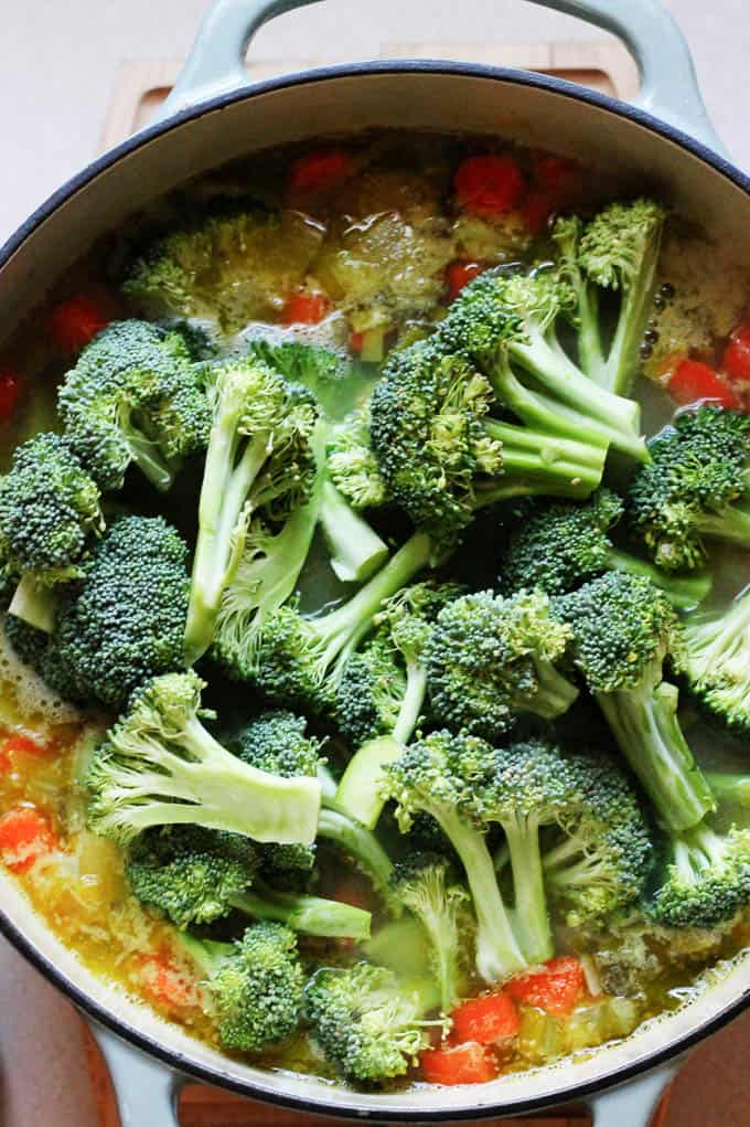 - After 20 minutes, add broccoli florets, bullion (if using), or salt and pepper; cover and cook for another 10-15 minutes until the broccoli florets are tender.