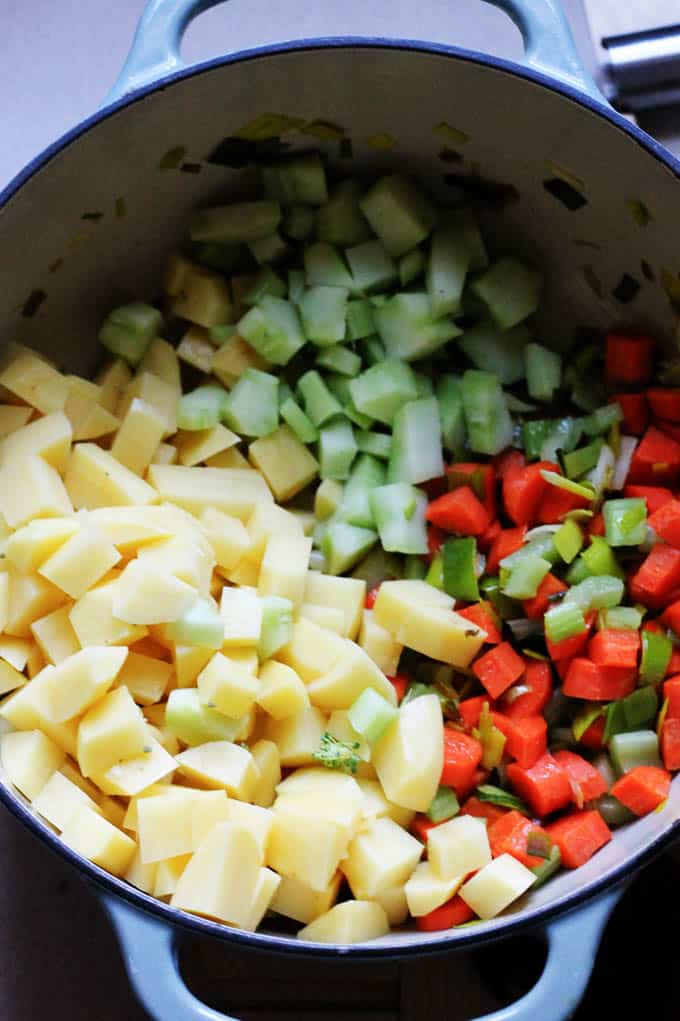 Vegetables: as the name suggests, you will need broccoli, potatoes, and leeks. But in addition, you’ll need carrots and celery as they always make every soup better. Yellow potatoes work best for this soup. When buying leeks, look for the thick ones with the long white part (the white part is only what you will be using, so you want to find leeks with a lot of it). When buying broccoli, look for the ones with all the green florets. You want the broccoli to be as fresh as possible. Avoid the ones that are turning yellow and have dark spots.