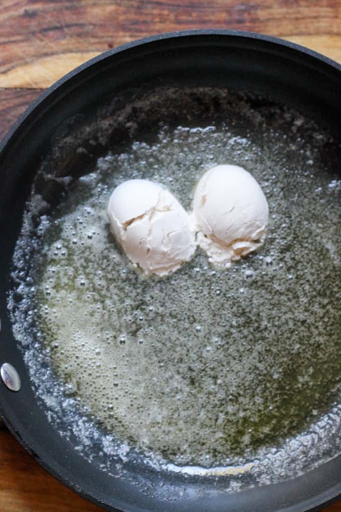 - Heat up your butter (or drippings or oil) in a skillet on medium-low heat,