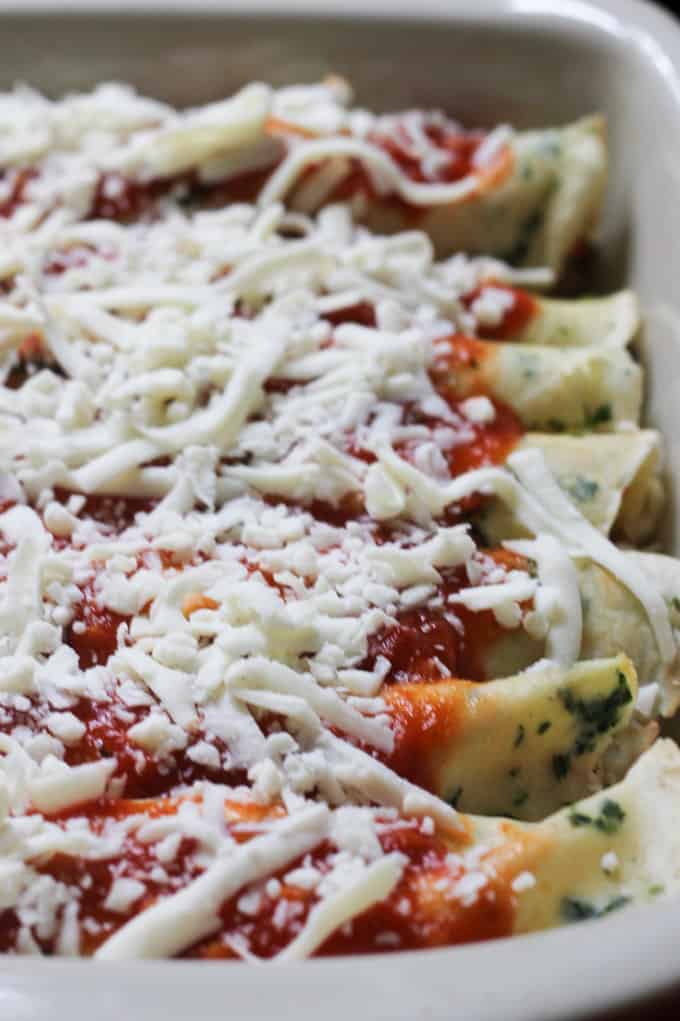 Then you finish off with Marinara sauce with more mozzarella cheese; thereby adding another depth of flavor and bringing some Italian flair to the dish. Admittedly it does look more like enchiladas than pasta (according to my husband). So if you don’t ruin the surprise ahead of time, then I’m certain you’ll be able to get some surprised reactions from whoever you serve this to.
