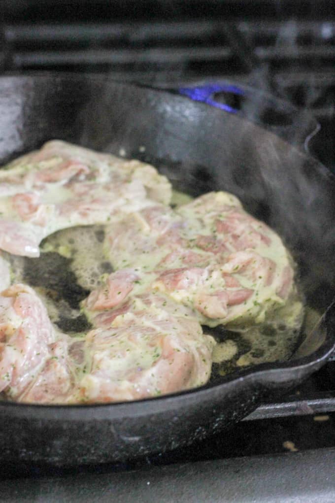 Step 3: Heat up another skillet (like cast iron) and add some cooking oil. Remove the chicken from a marinade and add to the skillet. Cook the chicken on each side for 7-8 minutes and then place it in a preheated oven (at 350F) for about 10 minutes, until the chicken is fully cooked and reaches the internal temperature of 165F.