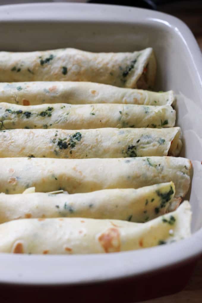Step 5: Assemble the crepes: on each crepe add shredded mozzarella cheese, sliced roasted peppers, and pieces of chicken. Roll it and add it to a baking dish. Continue with the remaining crepes. I used a 9×13 baking dish and I was able to add 7 pretty thick crepes. I’d say, depending on how much your crepes are stuffed you should be able to fit 6-8 crepes into a baking dish of that size.