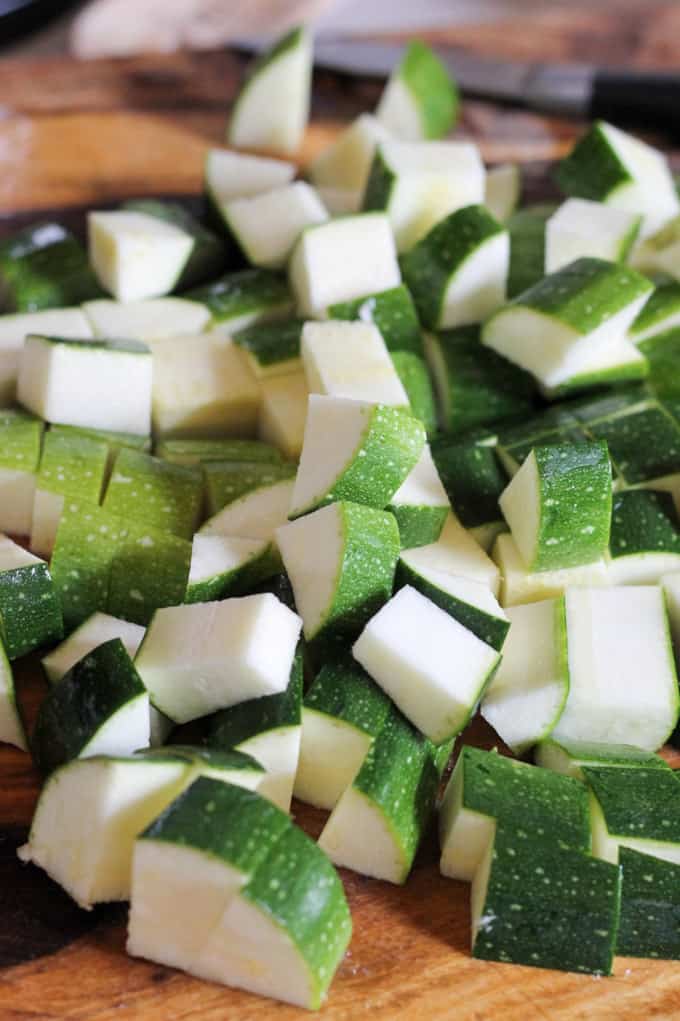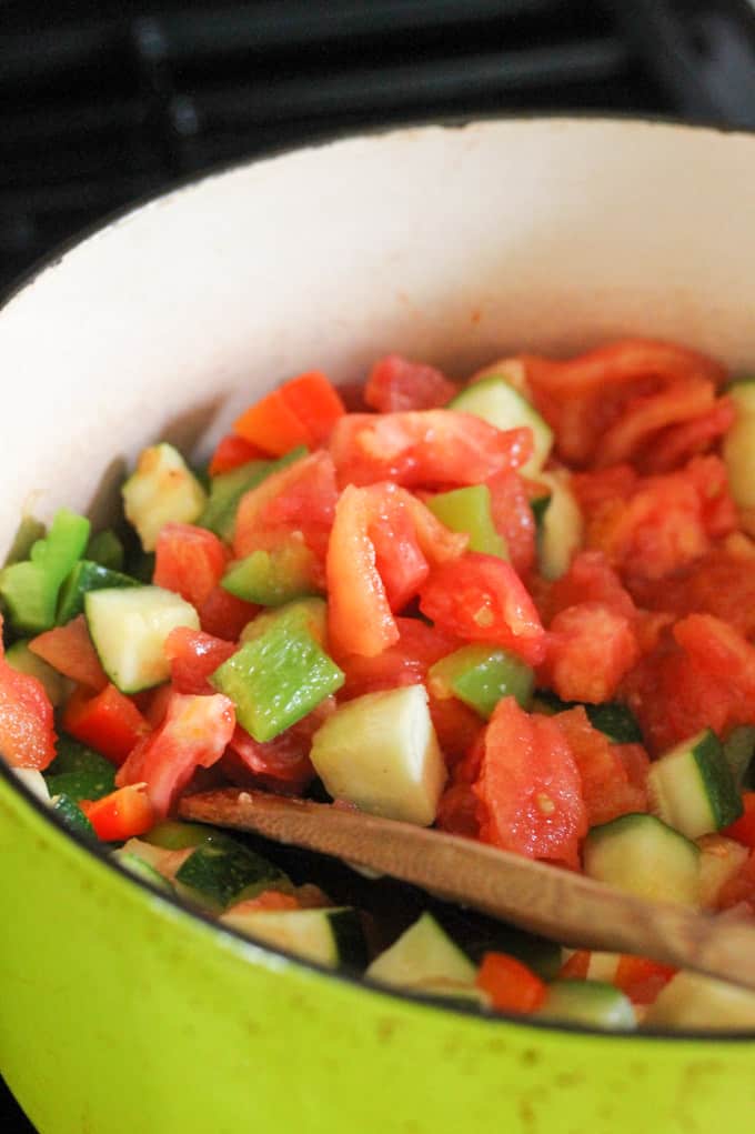 Step 1: Prep your vegetables: chop onions and garlic. Then cut peppers and zucchini into small squares. Parboil, peel and chop your tomatoes (Tip: Paraboiling your tomatoes in hot water for approximately 3 minutes will ensure that the skin will easily peel off)