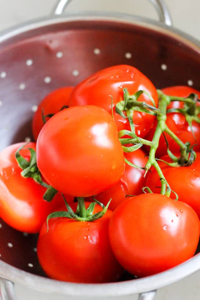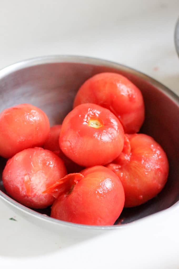 - Bring a pot of water to boil. Add tomatoes and leave them for 2-3 minutes until the skin starts to break. Remove to a colander and let cool off. Then peel the skin and chop your tomatoes.