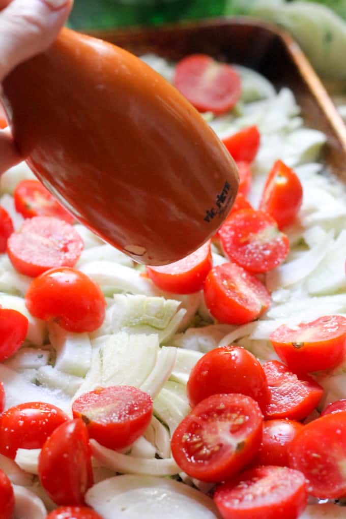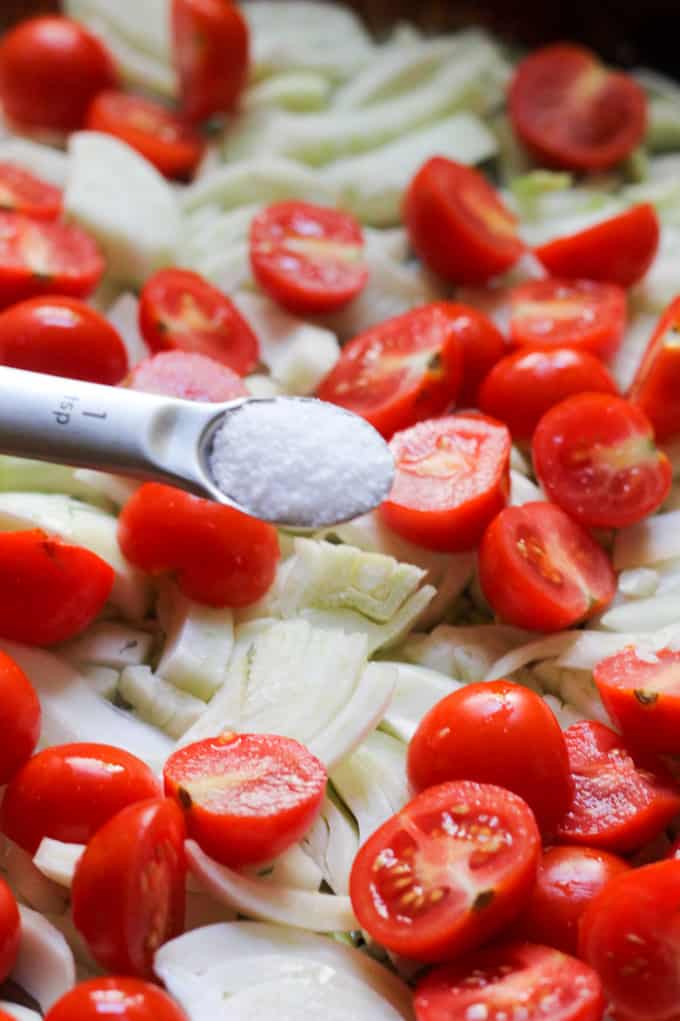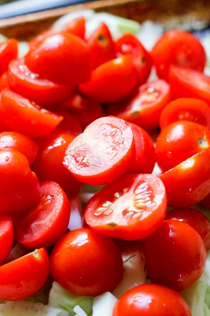 What surprised me though was the way the fennel was cut into tiny slices. This made it roast evenly and it paired beautifully with the small cherry tomatoes. Now I’d roasted fennel before, but never in slices like this, and to be honest there was always a piece somewhere that was either too hard or too chewy. Even though I love the taste of roasted fennel, this was always a little problematic for me. Once I tried this roasted fennel from the Italian store I immediately knew what I was doing wrong. I will show you below how to prep the fennel for perfect roasting.