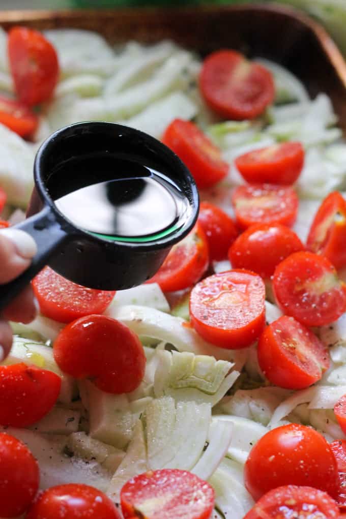 - Once your fennel is prepared you can spread it on the sheet pan; Add halved cherry tomatoes; Add Salt & Pepper;