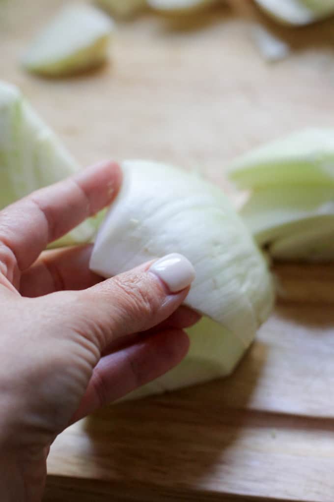Cut it in half. Cut in quarters. Remove the core. Remove the outer leaves (these are the ones that can get hard or chewy when roasted so you want to get rid of them). Slice your fennel into 1/4 inch pieces.